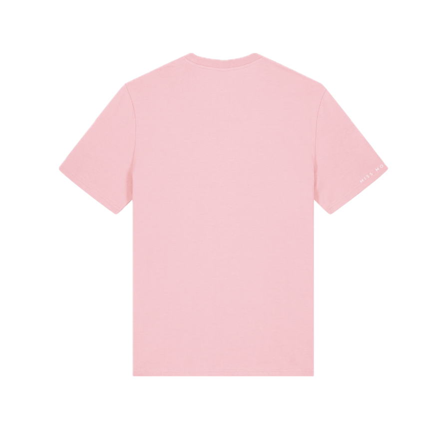 Dit roze T-shirt heeft een wit logo in het midden op de borst en tekst op de mouw.