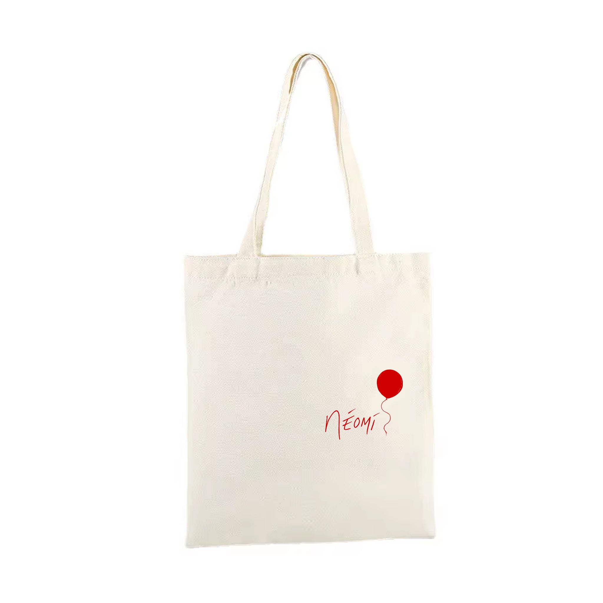 Size: approx. 40cm x 40cm. Off-white tote bad with red balloon and néomí logo in corner.