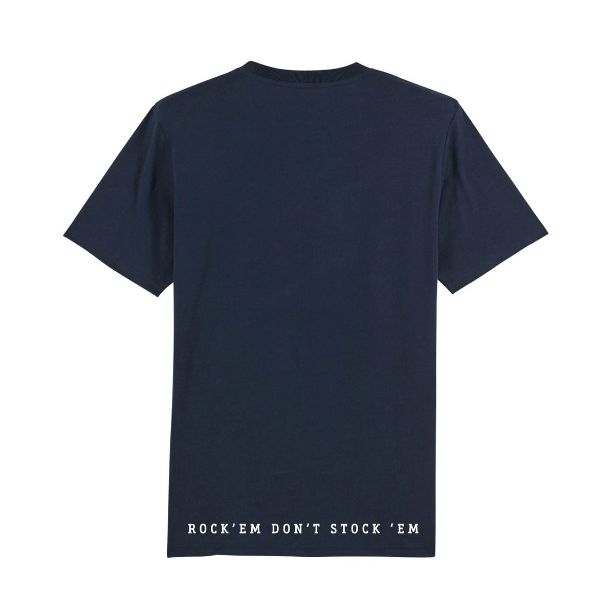 The RevWorks Basic Boxlogo T-shirt in a beautiful color combination of Navy blue with the slogan "Rock'em don't stock'em" in white on the lower back. This subtle logo T-shirt is a must-have for every