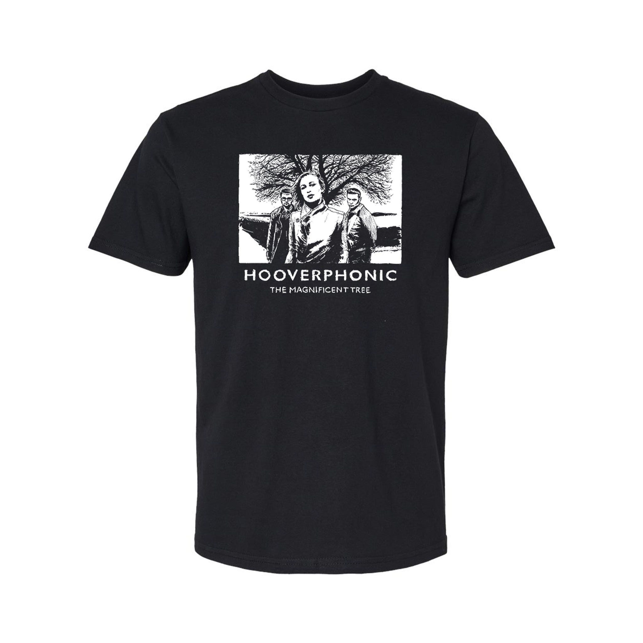Hooverphonic "The Magnificent Tree" - 185 gsm Classic Premium Combed ring spun Cotton T-shirt Standard fit in Black with white jumbo front print.